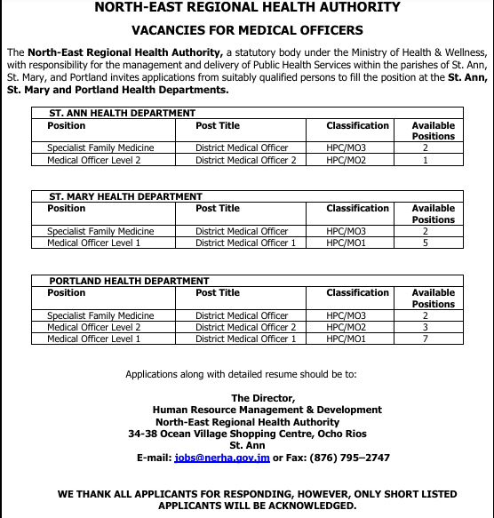 Medical Officers needed (St. Ann, St. Mary, Portland - Jamaica) - North Regional Health Authority